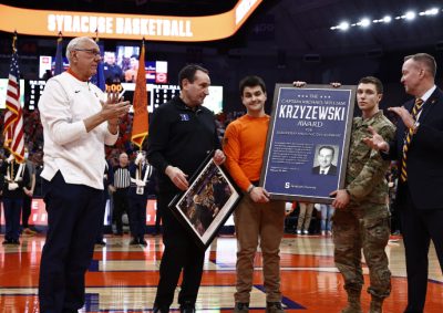 Syracuse University’s Vice Chancellor for Strategic Initiatives and Innovation, J. Michael Haynie, and D’Aniello Institute for Veterans and Military Families (IVMF) Advisory Board members Rich